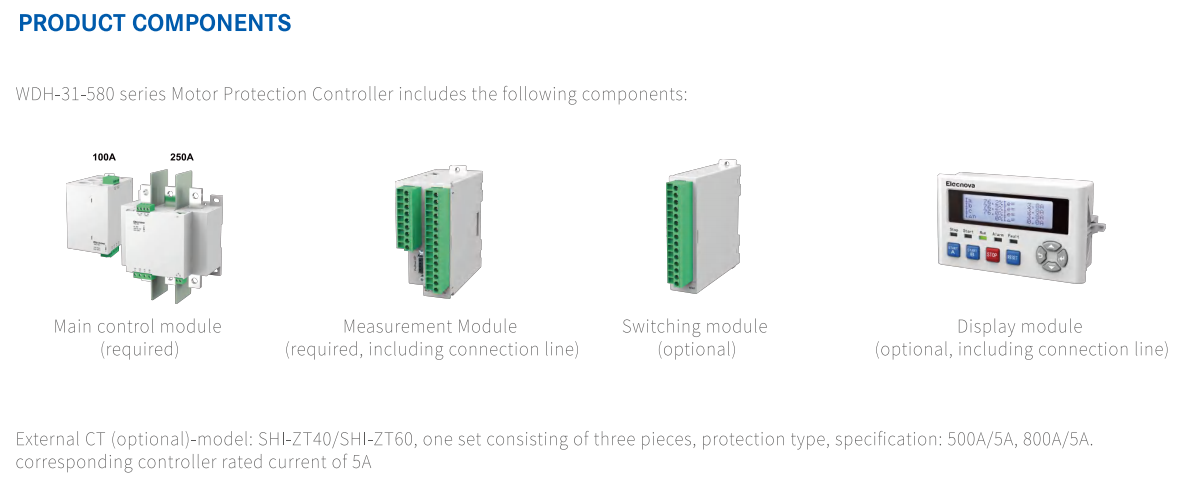 WDH-31-580 Bộ điều khiển và bảo vệ động cơ - Elecnova (viết tắt là WDH580) là một hệ thống điều khiển cụ thể cung cấp các chức năng bảo vệ và điều khiển hoàn chỉnh cho động cơ không đồng bộ như đối với thông số kỹ thuật sau.