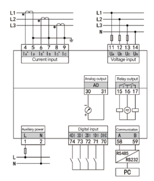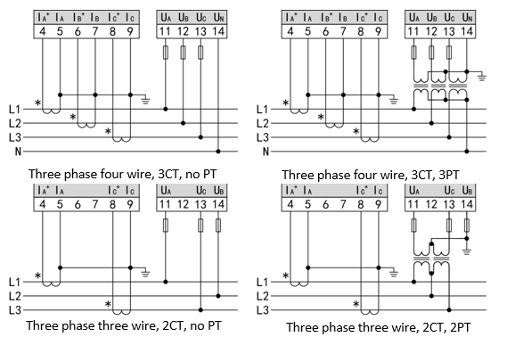 - Đồng hồ có thể hoạt động ở chế độ ba pha ba dây hoặc ba pha bốn dây và người dùng phải cài đặt chế độ nối dây tương ứng theo thực tế, nếu không dữ liệu đo của thiết bị sẽ không chính xác.