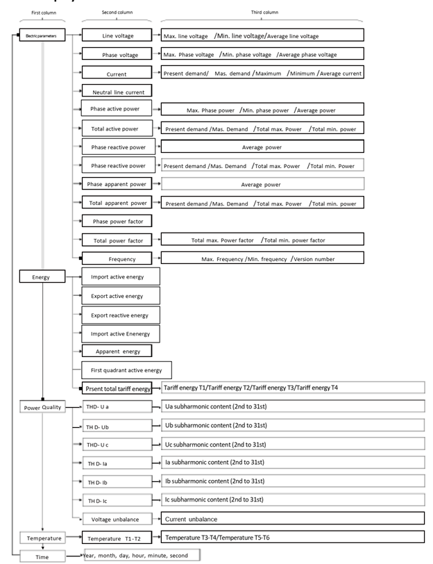 Đo lường chính xác cao tất cả các thông số điện thường được sử dụng trong hệ thống lưới điện ba pha: dòng điện ba pha, điện áp ba pha, công suất tác dụng, công suất phản kháng, hệ số công suất, tần số lưới, công suất tiêu thụ (kWh), năng lượng phản kháng (kVArh) và giao diện truyền thông và chức năng đầu ra xung năng lượng điện. Áp dụng giao thức truyền thông Modbus-RTU để kết nối với các hệ thống giám sát qua truyền thông có dây hoặc không dây. Nó có các đặc điểm cài đặt thuận tiện, nối dây đơn giản, số lượng công việc nhỏ, cài đặt lập trình trường cho các tham số đầu vào và có thể hoàn thành giao tiếp mạng với các PLC và máy tính điều khiển công nghiệp khác nhau trong ngành.