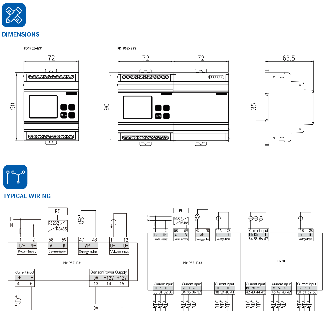 Đồng hồ đo điện một chiều PD195Z-E33 có thể đo điện áp lên đến 1000VDC và dòng điện thông qua CT Hall Sensor 4V