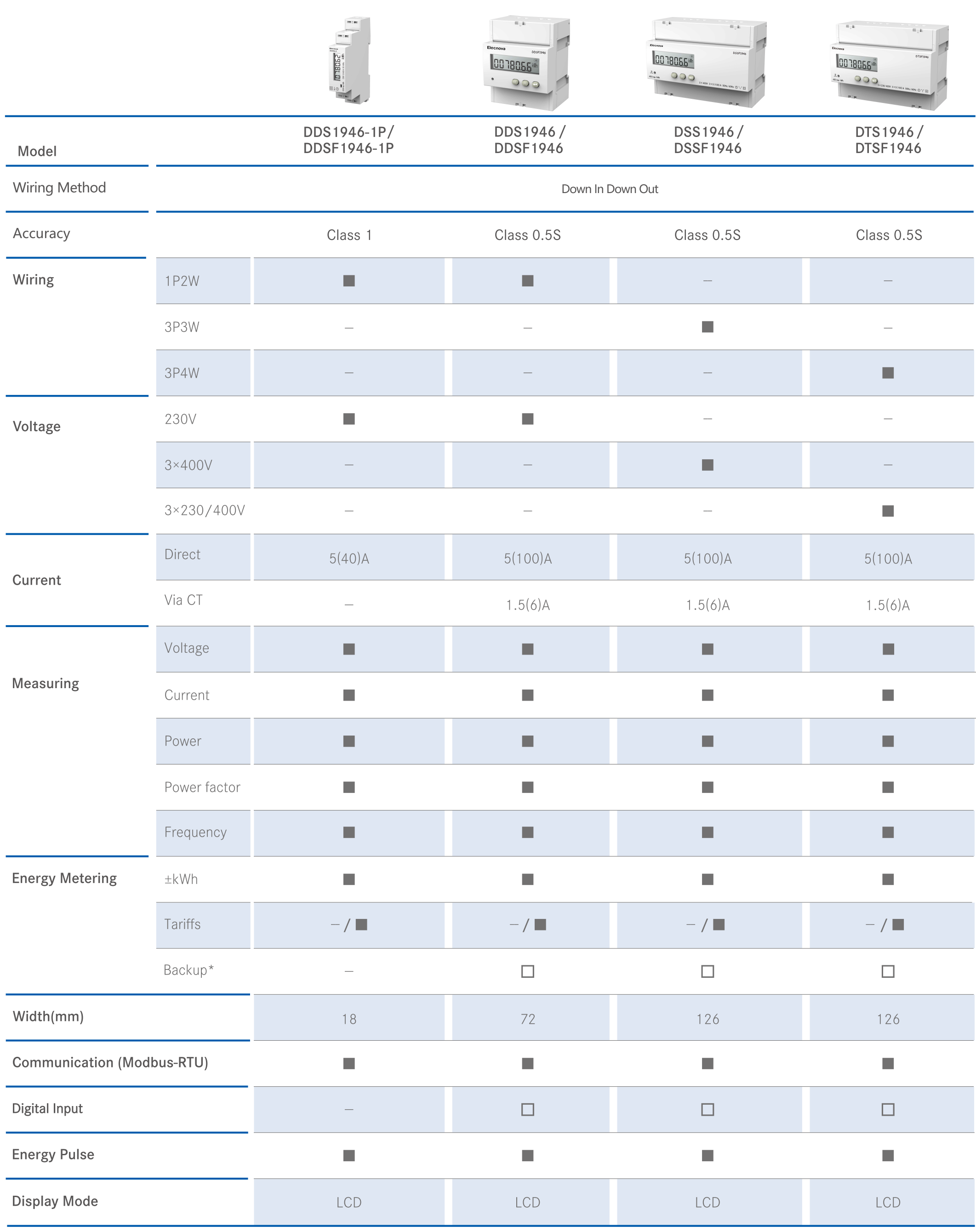 Đồng hồ được sử dụng kiểu "Plug-in" cài đặt dễ dàng với đầu vào trực tiếp lên đến 100A. Màn hình LCD kết hợp với cổng và mô-đun không dây gắn trên ray Elecnova din, kết nối dữ liệu giữa máy đo với nền tảng EMS trở nên thuận tiện hơn. DTS1946 được sử dụng rộng rãi ở người dùng thông minh, thương mại và dân cư như một đơn vị đo phụ. DDS1946 / DTS1946 / DSS1946 tuân thủ các tiêu chuẩn CE, MID.