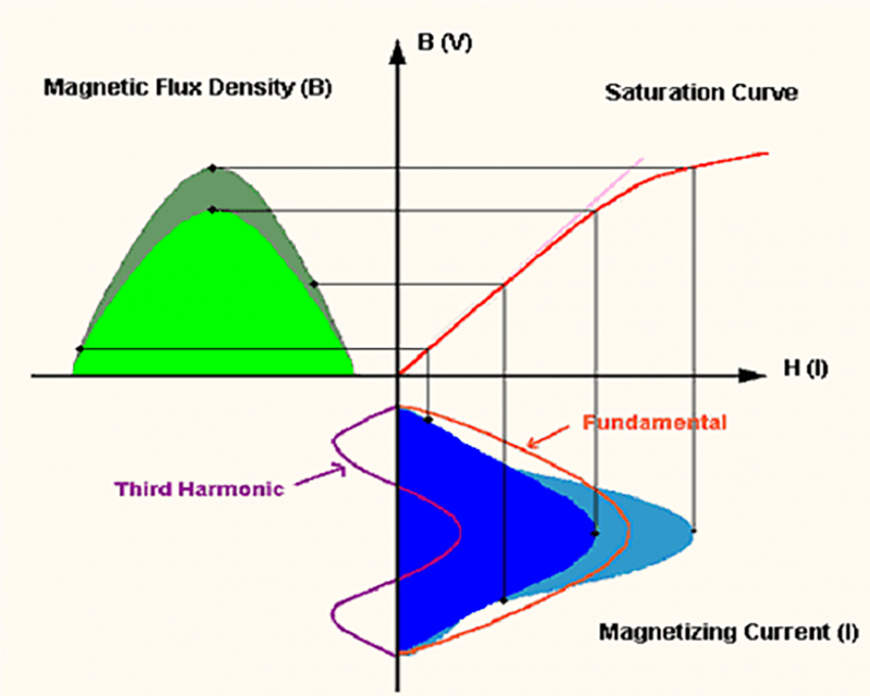 Máy biến thế: Để duy trì điện áp sin, từ thông sin phải tạo ra magnetizing current. Khi dòng điện đủ lớn sẽ dẫn đến điện từ lớn bị méo dạng và chứa song hài.